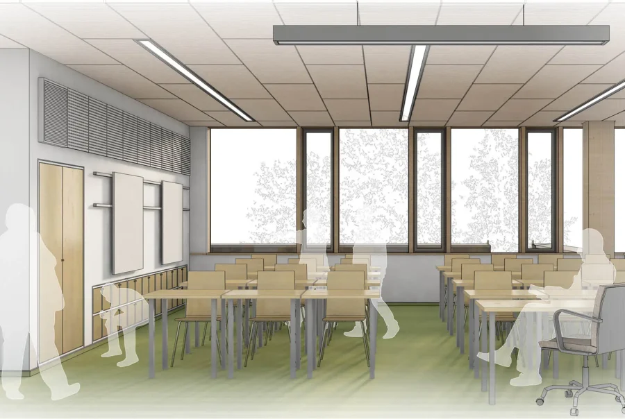 Wichtige Meilensteine dieser Umplanung sind einerseits die zukünftige Barrierefreiheit für einen inklusiven Unterricht und anderseits die Schaffung eines Effizienzgebäudes, das mit erneuerbaren Energien versorgt wird und mit modernster Haustechnik ausgestattet sein wird, wie z.B. einer dezentralen Klassenraumlüftung.